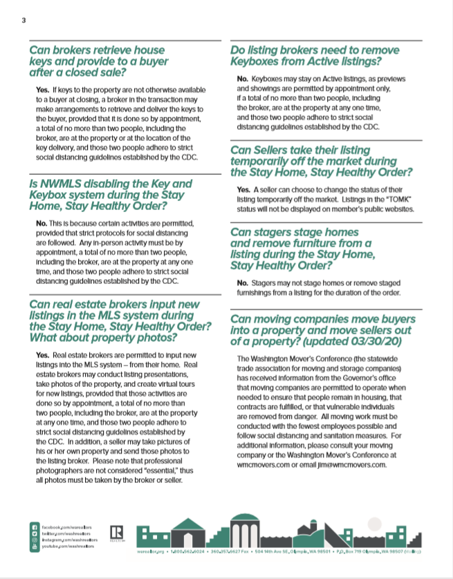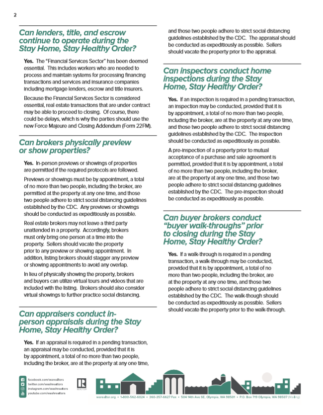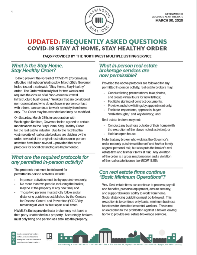 The need to allow members of our community to complete real estate transactions has been recognized, as the treat of displacement is a pressing issue in the PNW. We are now able to perform some of our Realtor® duties, however, there are certain restrictions. According to the latest Governor’s order, as of March 28th, 2020 brokers and one additional person are allowed to preview a property as long as social distancing rules are observed.